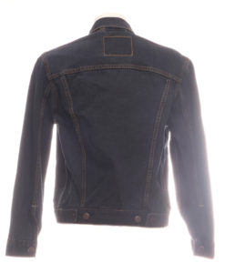 Levi’s denimjakke i truckermodell. To brystlommer. To sidelommer. Normale ermer. Jakken fremstår som sort eller veldig, veldig mørk blå.