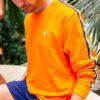 Blå hettegenser i bomull med brodert logo. Detaljer som oransje hettesnor og striper på utsiden av begge armene.